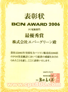 航嘉在日本銷售的EVERGREEN(航嘉新品GREEN STAR12公分風扇系列)電源以11萬臺的銷售量獲得日本最大IT雜志“BCN”2005年“最受歡迎電源產品”獎。