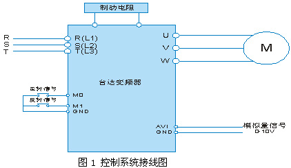 控制系統接線圖如圖1所示。選配電機為3.0KW/50Hz/380V,選用變頻器型號為VFD037M43,制動電阻400W/150ohm。