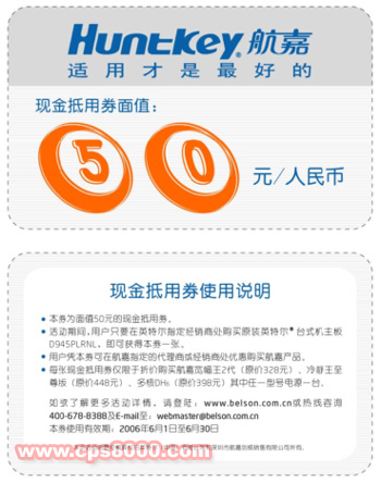 強強聯合,此次Intel攜手航嘉,共同打造完美雙核平臺。凡6月1-30日在Intel指定經銷商處購買原裝Intel臺式機主板D945PLRNL產品,即可獲得價值50元的航嘉電源現金抵用券一張 (僅限多核DH6、寬幅王Ⅱ代、冷靜王至尊版使用) 。