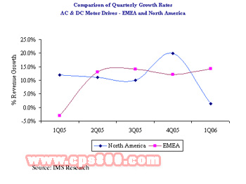 按照IMS research最近提供的數據,2004和2005年是最近十年以來全球直流馬達和交流馬達驅動設備市場發展最快速的兩年。這個市場的強勢包括了所有的產品種類,所有的能量范圍和所有的地區。中國市場毫無疑問是一個強力市場。北美則繼續其完美的增長。最大的驚喜來自歐洲,中東與非洲地區。在落后了數年之后,歐洲、中東和非洲市場成為發展僅次于中國的市場。