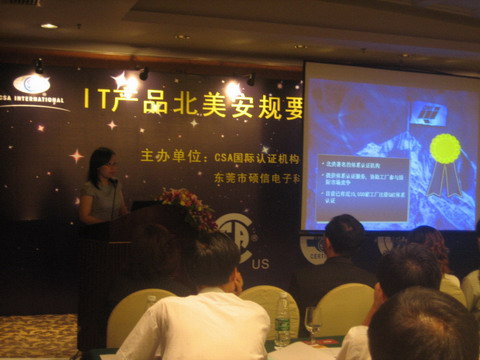 近日,北美地區最著名的產品認證機構—CSA國際認證機構聯合東莞市碩信電子科技有限公司召開了“IT產品北美安規技術專題研討會”。會議吸引了100多個企業的參加