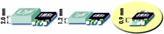 2006年,Micrel公司通過提供業界第一個8MHz的降壓調整器,打破了電感值1uH的最低值記錄。該解決方案的特點在于擁有一個電感值為0.47uH,體積僅為1.25x2x0.55mm的小型片狀電感器。與1MHz的解決方案相比,該調整器的電感器體積縮小了95%。如圖所示,這也是電感器首次比開關調整器IC封裝本身還要小。