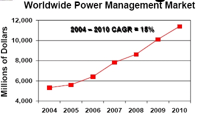 根據DATABEANS估計數據,從2004年至2010年每年電源銷售額以15%幅度增長(見圖1)。到2010年整個全球電源管理市場將存近120億美元的銷售額。應注意,電源在模擬器件市場份額大約占到40%~50%。