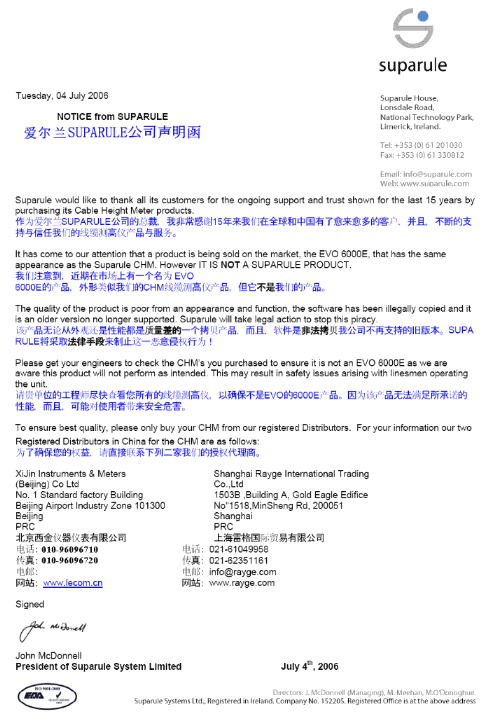 愛爾蘭公司關(guān)于中國市場上測高儀6000E的聲明函(圖)