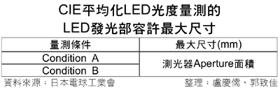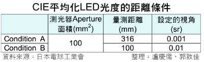 除了白光LED本身的條件與量測環境做了詳細的定義之外,該團體在量測法則中說明了測光器的規范,依照法則的指定是,量測時所使用的測光器,必須相當于JIS C1609中所規定的一般形AA級照度計,或者符合JIS Z 8724的分光測光器。在此份的準則中,還詳細定義的相當多的量測條件與數值,例如CIE平均化LED光度量測的LED發光部容許最大尺寸、LED的光束量測角度范圍等等,提供受測或待測機構作為參考的依據。