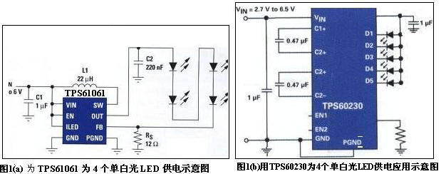 主要特點為:LED驅動器集成了過壓保護裝置;2.7V至6V的輸入電壓范圍;TPS67060最大支持3個LED;TPS61061最大支持4個LED;TPS61062最大支持5個LED;PWM亮度控制使能;流經LED電流(1LED)的數字亮度控制;1-MHz固定轉換頻率;內置400mA功率的MOSFET(場效應管)轉換開關;斷電期間關斷LED;工作狀態下所使用的小輸出電容可低至220nF。圖1(a)為TPS61061為4個單白光LED供電示意圖