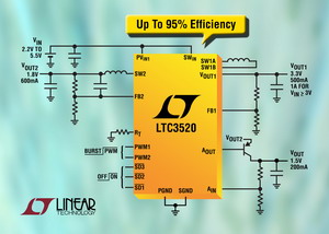 凌力爾特公司(Linear Technology Corporation)推出雙通道、2MHz 同步轉(zhuǎn)換器 LTC3520。一個通道采用同步降壓-升壓型拓?fù)洌梢蕴峁└哌_(dá) 1A 的連續(xù)輸出電流,輸入電壓可以高于、等于或低于輸出電壓。在需要 3.3V 輸出的單節(jié)鋰離子電池應(yīng)用中,與標(biāo)準(zhǔn)降壓型轉(zhuǎn)換器相比,該降壓-升壓型拓?fù)淇梢詫㈦姵毓ぷ鲿r間延長多于 25%。第二個通道是同步降壓型穩(wěn)壓器,可以在電壓低至 0.80V 時提供高達(dá) 600mA 的連續(xù)輸出電流。一個獨(dú)立的增益部件可被配置為一個 LDO 或電池良好比較器。這種組合非常適用于為同時需要 3.3V I/O 電源軌和 0.8V 至 1.8V 內(nèi)核電壓軌的 DSP/微控制器等應(yīng)用供電。LTC3520 用 2.2V 至 5.5V 的輸入電壓工作,同時開關(guān)頻率在 100kHz 至 2MHz 之間是用戶可編程的,使設(shè)計(jì)師能夠最大限度地提高效率,同時允許使用小的外部組件。高開關(guān)頻率加之 4mm x 4mm QFN 封裝確保為手持式應(yīng)用實(shí)現(xiàn)占板面積非常緊湊的解決方案。