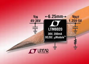 凌力爾特推出新的 DC/DC 微型模塊(uModuleTM)穩壓器系列的首款器件 LTM8020,該器件用高達 36V(40V 最大值)的更高電壓輸入電源工作。LTM8020 是一個 200mA 的完整 DC/DC 解決方案,器件中包含一個 DC/DC 控制器、電源開關、電感器、補償電路、以及輸入和輸出旁路電容器。這個解決方案極端緊湊,占板面積僅為 6.25mm x 6.25mm,而高度僅為 2.3mm。與線性穩壓器電路相比,LTM8020 效率更高的開關模式拓撲使工作溫度更低,熱量減少 98%,體積(面積 x 高度)縮小 90%,該器件采用緊湊型封裝,無需散熱器(比較條件:36VIN、1.5VOUT、200mA、TA = 25oC)。目標應用包括具有 24V 和 28V 輸入電源軌的系統,如醫療、工業、航空電子設備以及汽車售后加裝設備。