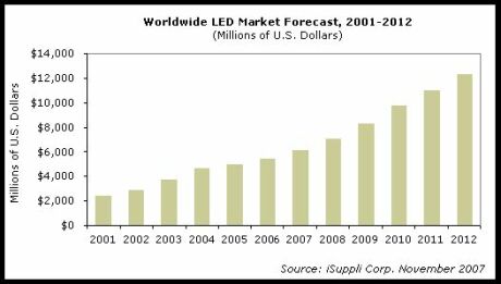 ISuppli公司預測,2007年總體LED市場營業額將增長大約13.7%,2006-2012年的年復合增長率約為14.6%,到2012年將達到123億美元。2005和2006年全球LED市場營業額僅分別增長2.1%和8.7%。這些數字包含全部表面貼裝器件(SMD)和通孔封裝LED燈以及字母數字顯示LED——包括標準亮度、高亮度(HB)和超高亮度(UHB)LED。