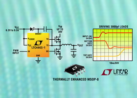 LTC4442/-1 采用耐熱增強(qiáng)型 MSOP-8 封裝,在 -40oC 至 85oC 的溫度范圍內(nèi)工作,以 1,000 片為單位批量購買,每片價(jià)格為 1.25 美元。