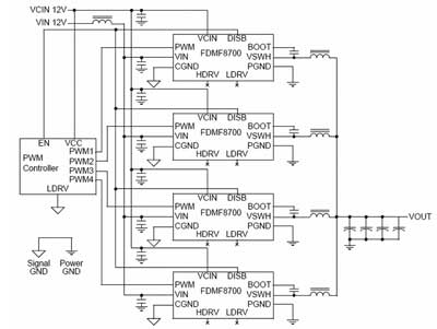 圖4 基于最新發(fā)布的驅(qū)動(dòng)器+FET MCM的4相降壓轉(zhuǎn)換器電路