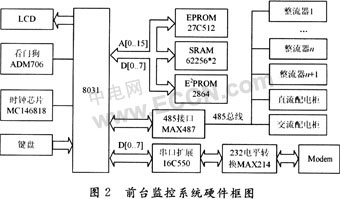 前臺監控系統硬件框圖見圖2,系統以8031單片機為核心,人機界面采用LCD顯示,有操作鍵盤。看門狗采用ADM706,以提高系統可靠性。時鐘芯片采用MC146818,用于記錄實時數據或告警信息產生的時間。程序存儲器采用27C512 EPROM,系統使用到的有限漢字庫存放在27C512的高端地址,數據存儲器采用2片62256 SRAM和1片2864E2PROM。2864是電擦寫、非易失存儲器,用于保存系統的運行參數,該參數可以在前臺通過鍵盤設定,也可通過監控中心遠程設定。采用MAX487擴展一個485接口,用于同交流配電柜、直流配電柜、整流器模塊以及其他環境設備的通信。數據采集用的傳感器放置在交流配電柜、直流配電柜、整流器等相對獨立的智能設備中。采用可編程通用異步通訊接口芯片16C550和電平轉換芯片MAX214擴展了一個RS 232口,用來連接Modem。