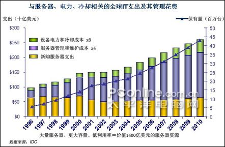 很多企業(yè)目前的數(shù)據(jù)中心隨著業(yè)務(wù)的擴展變得越來越龐大,企業(yè)為所擁有的服務(wù)器及數(shù)據(jù)中心每年所支付的電費和維護成本上升得很快,并有進一步加快的趨勢。這是IT技術(shù)不斷發(fā)展給人們帶來的一個副作用。依照摩爾定律,芯片中的晶體管和電阻器的數(shù)量每兩年會翻番,顯然芯片所耗用的能源也會增加,使得企業(yè)在享用高性能IT產(chǎn)品的同時,也要無奈地支付高昂的電費。目前數(shù)據(jù)中心不但要為新購進的服務(wù)器、存儲等設(shè)備支付費用,還要為設(shè)備的運轉(zhuǎn)、冷卻、占地面積支付費用,這逐漸成為了擺在企業(yè)CIO與CFO之間的一大難題。