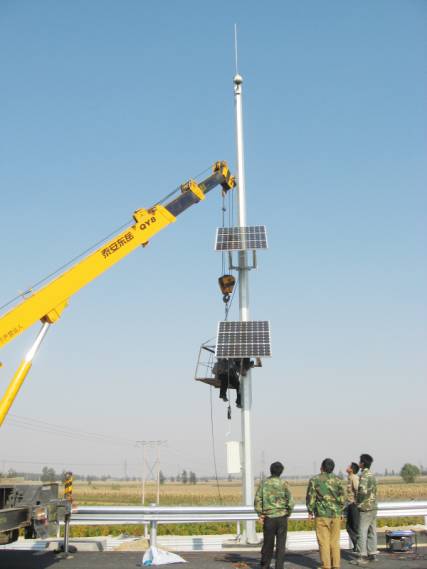 該系統(tǒng)由太陽能電池組件、太陽能控制器、蓄電池組構(gòu)成。電池板安裝在高達(dá)5米的攝像機(jī)立柱上,蓄電池埋在地下用水泥封固,能有效地防止人為破壞,是解決高速公路遠(yuǎn)程供電的較好方法。