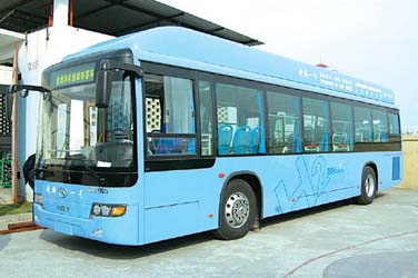 一種"喝"氫的燃料電池新能源城市大客車"神力一號",載客示范運行在上海"2007中國國際工業博覽會"上,吸引了眾多前來參觀的游客。