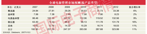 Databeans預測在未來五年,總體電源管理市場將達到324億美元,占到整個半導體市場的7%。穩(wěn)壓器市場預計從2006年的60億美元增長到2012年的132億美元,年復合增長率為16%,這已經(jīng)明顯高于大多數(shù)半導體產(chǎn)品的銷售額預計。在未來五年,電源集成電路的銷售額預計以11%的年平均增長率發(fā)展,而分立電源產(chǎn)品銷售額增長率預計為8%。