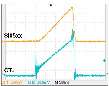 這種令人迷惑的簡單架構卻能提供許多傳統電流檢測技術無法提供的優點。例如,通過使用標準CMOS處理技術和半導體封裝實現了極低的成本,這兩種技術使得該架構的成本可能比CT的安裝成本還有競爭力,而且還有更高可靠性和更小體積等附加優點。同時還實現了較低的損耗,這是因為嵌片在電流檢測通道中僅僅增加了1.3mΩ的串聯電阻和2nH的串聯電感。還有一個附加的優點,就是通過對積分操作進行平均,將輸出噪聲減到了最小,從而節省了外部RC濾波器的成本和空間。它甚至還能抑制變壓器耦合設計中的邊沿噪聲,從而無需邊沿消隱。圖2和圖3分別通過將未濾波的輸出比作(在低值傳感電阻上使用差分探頭)測得的電流和CT電路(CT、二極管和RC濾波器)來展示了低噪聲原理。在兩種情況下,交流電流傳感器都幾乎沒有噪聲。