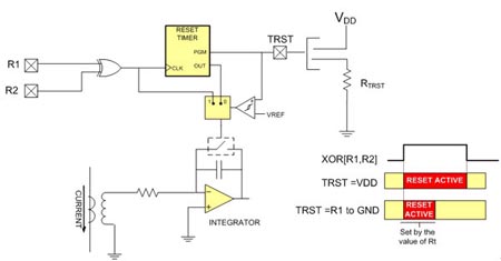 如圖4所示,當TRST輸入被連接到VDD時,積分器復位可以受R1和R2上的信號的實時控制。為了滿足高頻或/和高占空比應用,可以將TRST通過定時電阻RTRST連接到地來縮短復位時間。在這種情況下,復位的啟動由R1和R2觸發,持續時間則由RTRST決定。在較高速度的操作時,允許用戶對傳感器精度進行調整。