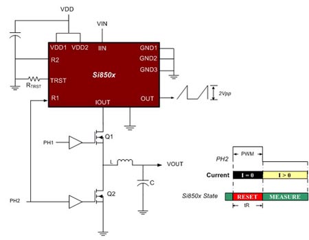 片上積分器復位邏輯具有足夠的靈活度,允許這種電流傳感器能夠與任意的電源系統拓撲一起使用。圖4所示的是用于單輸出Si850x的復位電路。這些器件通常可以用于不存在變壓器磁通平衡控制問題的相對簡單一些的應用(如降壓和升壓電路)中。