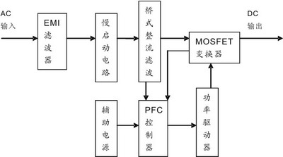 AC輸入經過EMI濾波電路濾除差摸和共摸電磁干擾信號后,輸入至慢啟動電路,再經延時后全壓加到橋式整流電路,輸出的直流電壓提供給功率場效應管MOSFET的漏極。PFC控制器是由8引腳的LT1249功率因數控制芯片和較少的外圍元件所構成的電路。其第8引腳輸出開關頻率為100kHz的驅動信號,經驅動電路加到MOSFET功率開關管的柵極,MOSFET變換器開始以一定的占空比進行通斷工作,并輸出所需求的直流電壓。凌力爾特公司生產的LT1249集成芯片內置振蕩器、電流乘法器、電流放大器、誤差電壓放大器、電壓比較器及基準電壓源等單元。通過對設定的高頻率脈寬調制電流進行平均處理,LT1249可以實現盡可能低的電流失真,并且可以工作于連續和非連續的工作模式。另外,內置電流乘法器對來自誤差電壓放大器的電流進行平方運算可以降低輕載時的AC增益,進而可保持較低的電流失真和較高的系統穩定性。PFC控制器分別從橋式整流、變換器及它們之間傳感電阻提取感應信號實現多種保護功能,如峰值電流限制和過壓保護等。DC/DC變換器電路簡化框圖由圖2所示。