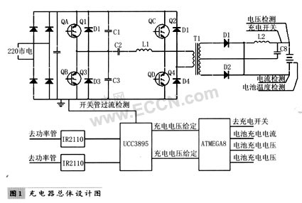 充電對象為鎳氫電池,采用電壓,電流反饋的方法來達(dá)到恒流,恒壓充電的目的,同時對充電過程中的各種參數(shù)進(jìn)行檢測和控制。該充電器的總體設(shè)計如圖1。