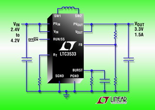 LTC3533 含有兩個 N 溝道 MOSFET 和兩個 P 溝道 MOSFET(RDS(ON) 分別為 0.06Ω 和 0.08Ω),能提供高達 96% 的效率。可編程的突發模式(Burst Mode®)工作允許用戶對啟動節能突發模式的負載電流編程。突發模式運作僅要求 40uA 靜態電流,而停機電流低于 1uA,這進一步延長了電池工作時間。其它特點包括軟啟動、限流、熱停機和輸出斷接功能。