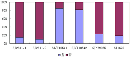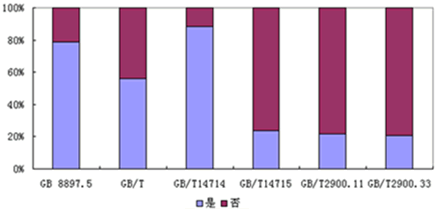 次調查中涉及:SJ2811.1-87《通用直流穩定電源術語及定義、性能與額定值》,SJ2811.2-87《通用直流穩定電源測試方法》,SJ/T10541-94《抗干擾型交流穩壓電源通用技術條件》,SJ/T10542-94《抗干擾型交流穩壓電源測試方法》,SJ/Z9035-87《測量用穩定電源裝置》,SJ1670-80《電子設備電源名詞術語》。其中SJ/T10541-94《抗干擾型交流穩壓電源通用技術條件》,SJ/T10542-94《抗干擾型交流穩壓電源測試方法》企業執行標準較高,分別達到85.0%和82.0%。