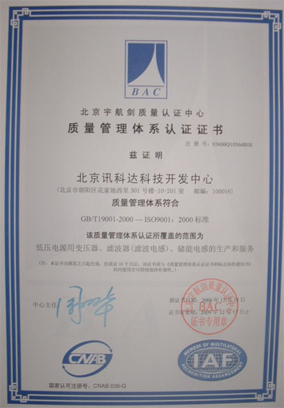 訊科達從創建起就著手貫徹GB/T19901-2000質量管理要求,GJB9001A-2001質量管理要求,建立質量保證體系。本公司在2006年12月份已經嚴格的通過GB/T19001-2000idtISO9001:2000質量管理體系認證。本公司已經形成一個完善的的生產、科研、銷售系統,擁有了一只熟悉軍用標準、行業標準的工程技術隊伍