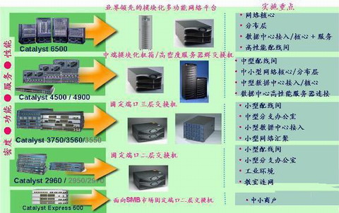 思科中端模塊化機箱Catalyst 4500和高密度服務器群交換機Catalyst 4900,可應用于中型配線間和中小型網絡核心分布層,成為中型數據中心接入的核心,為數據中心高性能服務器連接;擁有業界領先的模塊化多功能網絡平臺 Catalyst 6500,作為網絡核心,在網絡分布層為企業提供數據中心接入,并提供服務,是大型企業常用的網絡設備。