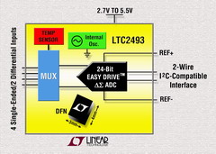 • 集成絕對準確度為 2oC 的溫度傳感器(LTC2493 和 LTC2487)