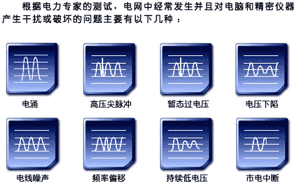 有一個常見的錯誤概念,認為我們使用的市電,除了偶爾發生的斷電事故,是連續而且恒定的,其實不然。市電系統作為公共電網,上面連接了成千上萬各種各樣的負載,其中一些較大的感性、容性、開關電源等負載不僅從電網中獲得電能,還會反過來對電網本身造成影響,惡化電網或局部電網的供電品質,造成市電電壓波形畸變或頻率漂移。另外意外的自然和人為事故,如地震、雷擊、輸變電系統斷路或短路,都會危害電力的正常供應,從而影響負載的正常工作。根據電力專家的測試,電網中經常發生并且對電腦和精密儀器產生干擾或破壞的問題主要有以下幾種: