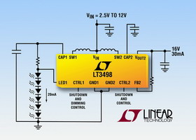 凌力爾特(Linear Technology Corporation)推出雙輸出升壓型轉換器 LT3498,該器件含有一個 2.3MHz PWM LED 驅動器和一個低噪聲 OLED 驅動器。LT3498 的每個通道都有內部電源開關和肖特基二極管,這些都包含在 2mm x 3mm 的 DFN 封裝內。該器件的 2.5V 至 12V 寬輸入電壓范圍使其能夠用高達 12V 的固定輸入軌單節鋰離子電池工作,從而提供高達 32V 的輸出。每個轉換器都可以獨立調光或停機。采用單節鋰離子電池輸入時,LED 驅動器通道可以驅動多達 6 個串聯的 20mA 白光 LED,同時 OLED 驅動器可以提供高達 24mA/16V 的輸出。這個高度集成的電源解決方案非常適用于雙顯示器電子設備。