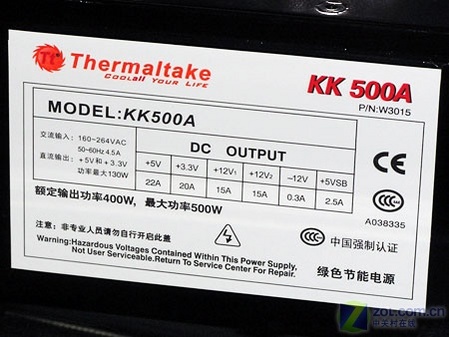 Tt金剛系列KK500A電源擁有主動PFC設計、14cm靜音設計、兩個6PIN PCI-E顯卡接口,6組S-ATA接頭及6組4針電源接頭等等諸多的技術特性。從產品的規格以及價格上來看,這款額定功率為400W的電源非常適合中高端平臺選購。