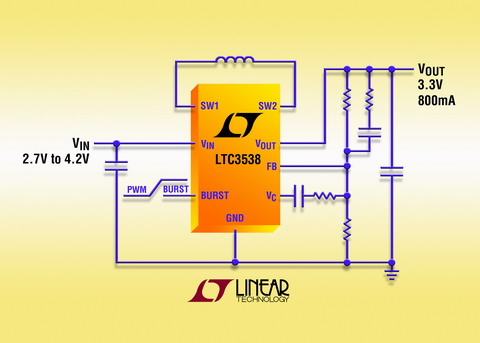 LTC3538 包含兩個 N 溝道 MOSFET 和兩個 P 溝道 MOSFET(分別為 0.17Ω 和 0.20Ω),以實現高達 96% 的效率。突發模式(Burst Mode®)工作僅需要 35uA 靜態電流,而停機電流可低于 1uA,以進一步延長電池工作時間。其他特點包括軟啟動、限流、熱停機和停機時輸出斷接。