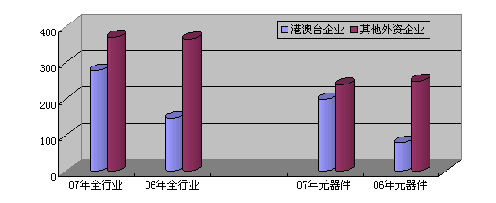 港澳臺(tái)企業(yè)與外商投資的不同發(fā)展趨勢(shì),引起了我國電子信息產(chǎn)業(yè)投資結(jié)構(gòu)的變化。1-6月三資企業(yè)在我國大陸的總投資中, 港澳臺(tái)企業(yè)與外資企業(yè)投資比例由去年的1:2.5變?yōu)榻衲甑?.5:2,港澳臺(tái)企業(yè)投資比重明顯上升,對(duì)外商投資的替代顯著。特別在電子元器件行業(yè)表現(xiàn)尤為突出,1-6月電子元器件行業(yè)中,港澳臺(tái)企業(yè)累計(jì)投資198.8億元,同比增長(zhǎng)151.6%;外商投資企業(yè)累計(jì)投資239.4億元,同比下降4.1%;港澳臺(tái)企業(yè)與外資企業(yè)投資比例由比去年的1:3變?yōu)榻衲甑?.8:2.2。
