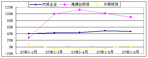 內(nèi)資企業(yè)1-6月累計(jì)完成投資494.1億元,同比增長(zhǎng)46.2%。其中私營(yíng)企業(yè)投資增長(zhǎng)最快,累計(jì)完成投資125億元,同比增長(zhǎng)達(dá)82.2%,增速較去年同期提高5.8個(gè)百分點(diǎn),占內(nèi)資企業(yè)總投資的比重達(dá)到25.3%,比去年上升了5個(gè)百分點(diǎn)。股份有限公司與其他有限責(zé)任公司投資同比增長(zhǎng)分別為29.3%和49.5%,增速較去年低6.4和38.2個(gè)百分點(diǎn)。