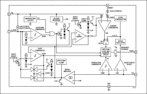 圖1:凌力爾特的LTC3801采用突發模式將靜態電流降至10至20uA。