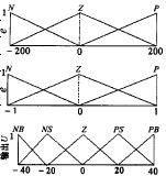 定義輸入量e和e的模糊集為:{負(N)、零(Z)、正(P)},控制量u的模糊集為{負大(NB)、負小(NS)、零(Z)、正小(PS)、正大(PB)},對應隸屬函數(shù)均為三角型(圖3)。基于式(2)PID專家知識的模糊變量賦值按以下過程建立:因PID調節(jié)器的比例與微分系數(shù)之比kp/kd=200,若e的變化范圍是[-1,1],則可以確定e的變化范圍是[-200,200]。如果e是負(-1),且e也是負(-200),那么基于PID的模糊推理結果即控制量u約是-40,也就是說u值論域中的負大(NB)對應于-40。依此類推,可獲得其余推理結果,模糊控制表如表1所示。