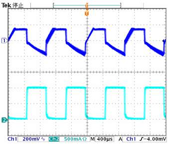 AP3700采用電流模式控制,且始終保持斷續模式運行,這都使得輸入-輸出的傳輸函數簡單,因而瞬態響應速度快、電壓過沖小。圖7是是負載動態特性,過沖電壓350mV。
