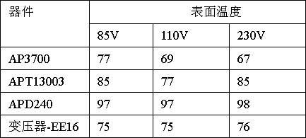 這里的操作完全是按照嚴格的測試程序,PCB板安裝到標準的充電器外殼里,見圖3。在外殼環境溫度為40℃時進行老化實驗,通過探頭測試幾個核心器件的表面溫度,見表2。