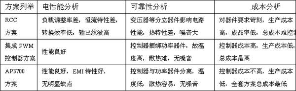 采用TO-92封裝的AP3700方案,看上去沒有集成PWM控制器解決方案或自激振蕩RCC方案簡潔,但AP3700方案決不是低端方案,相信上述測試結果已經給人一目了然的印象。下面再作詳細對比,見表3。
