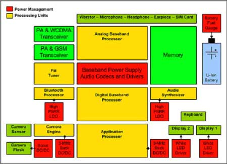 圖字(上下、左右):電源管理、處理單元、PA與WCDMA收發器、PA與GSM收發器、調頻接收器、藍牙處理器、高PSRR LDO、相機傳感器、相機閃光燈、相機引擎、升壓DC/DC、3MHz降壓DC/DC、振動器-麥克風-耳機-耳承-SIM卡、模擬基帶處理器、基帶電源 /音頻編解碼器與驅動器、數字基帶處理器、應用處理器、存儲器、音頻綜合器、高PSRR LDO、鍵盤、顯示屏1、顯示屏1、3MHz降壓DC/DC、白LED驅動器、白LED驅動器、電池容量計、鋰離子電池。