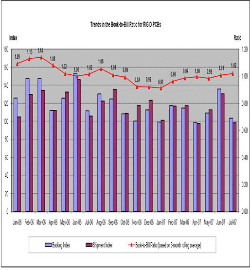 圖解:IPC公布7月北美印制電路板(PCB)的統計數據。與2006年7月相比,2007年7月硬性電路板出貨量下降7.1%,訂貨量下降1.8%。年初至今,硬性PCB出貨量下降10.4%,訂貨量下降14.6%. PCB業增長率和訂購運銷值比公布相比較上個月。硬性電路板出貨量減少17.7%,訂貨量減少17%,北美硬性電路板2007年7月的購運銷值比保持在1.02以上。 2007年7月較2006年同期,軟性電路板出貨量降低0.8%,訂貨量上升24.6%。今年迄今,軟性電路板出貨量下降2.1%,訂貨量同比增長9.1%。相比上個月,軟性電路板出貨量減少13.7%,訂貨量減少12.8%。7月份,北美軟性電路板訂購運銷值比保持在1.04。