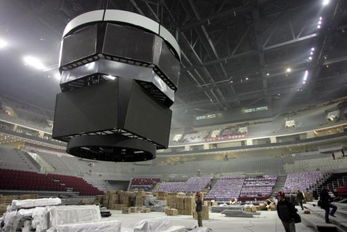 12月26日,國內首套全彩高清LED顯示系統落戶奧運五棵松籃球館。目前,這套顯示系統已安裝就位,正在加緊進行調試。2007年12月27日,全彩高清LED顯示系統在五棵松奧運籃球館安裝完畢,為滿足奧運會及賽后NBA籃球比賽的需要,這套系統由漏斗屏、環形屏及計時記分控制系統三部分組成,凈高9.042米,最大直徑約為11米,重22噸。