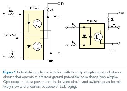 有不同潛路工作的電路中,用光耦建立電流隔離看上去似乎很簡單。光耦從隔離電路中獲取能量,由于LED老化,開關相對慢且不穩定。若不用光耦,可使用如Analog Devices公司的ADUM12xx或Texas Instruments 公司的ISO72x替代。本設計方案闡述了一個簡單改進光耦電路的方法。