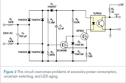 圖2的設計克服了能耗過大、不確定開關和LED老化的問題。它非常適用于寬交流范圍的應用。與圖1的電路相比,圖2的LED只在過原點附近發光,且由前置充電電容接收能量,所以通過10到100的因數減少平均電流消耗。設計也提供更快、更確定和更敏銳的開關。更甚者,希望延緩LED老化。圖1中電阻R1和R2消耗的熱功率不小于1.5W,所以在同一電路板區域用0.1W設備替換外部器件(圖2)。