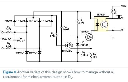 一些應用不需要Schmitt觸發器固有的磁滯性;圖3顯示了這樣的一個設計。它也顯示了怎樣處理不需要的D1最小反轉電流。然而,電路更適用于純同步和非晶閘管控制。由于LED電流的穩定性,這些設計使輸入交流電壓的范圍擴大,其有利于多標準交流供電設計;有機會在LED沒有過載危險的情況下設置LED電流;減少光耦不穩定的影響。這樣設計的另一個優勢為其固有更安全的特性。在其終端短路的情況下,光耦在隔離與非隔離側之間傳遞的電流比圖1電路中少10到100倍。光耦也有優勢。由于低占空比,可以不損失功率而任意減少光耦負載電阻R8的值。這個減少將使過原點誤差降低。