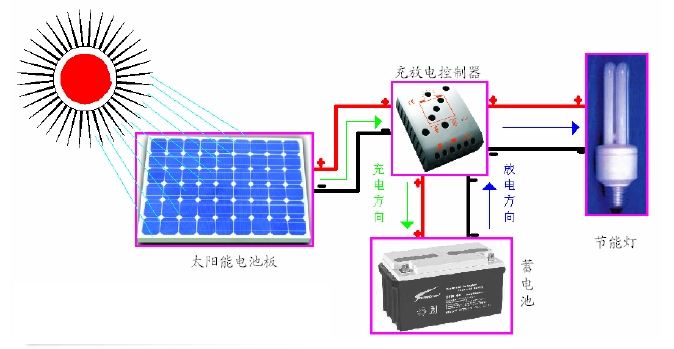 系統(tǒng)工作原理簡(jiǎn)單,利用光生伏特效應(yīng)原理制成的太陽(yáng)能電池白天太陽(yáng)能電池板接收太陽(yáng)輻射能并轉(zhuǎn)化為電能輸出,經(jīng)過(guò)充放電控制器儲(chǔ)存在蓄電池中,夜晚當(dāng)照度逐漸降低至10lux左右、太陽(yáng)能電池板開(kāi)路電壓4.5V左右,充放電控制器偵測(cè)到這一電壓值后動(dòng)作,蓄電池對(duì)燈頭放電。蓄電池放電8.5小時(shí)后,充放電控制器動(dòng)作,蓄電池放電結(jié)束。充放電控制器的主要作用是保護(hù)蓄電池。