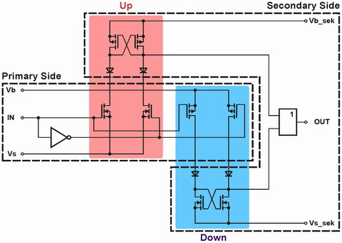 BOT電平轉換器的基本原理如圖 2a所示。在兩個獨立的傳輸通道上驅動一個TOP和一個BOT電平轉換器。電平轉換器是在每個路徑上帶額外二極管的常規靜態CMOS電平轉換器。根據原邊和副邊間電平轉換的極性,TOP或BOT電平轉換器被用于信號轉換,而其他級別的電平轉換器被反向二極管所阻擋。在副邊,所需要只是簡單的OR電路。
