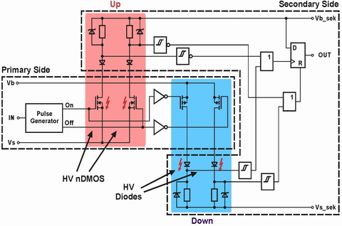 TOP開關電平轉換器的實現(圖2b)更為復雜,因為沒有阻斷電壓為600V 的P-MOS晶體管可供使用。由于這個原因,采用了基于高壓nDMOS和高阻斷二極管的脈沖信號轉換。脈沖轉換可減少橫向電流,從而減少開關損耗。